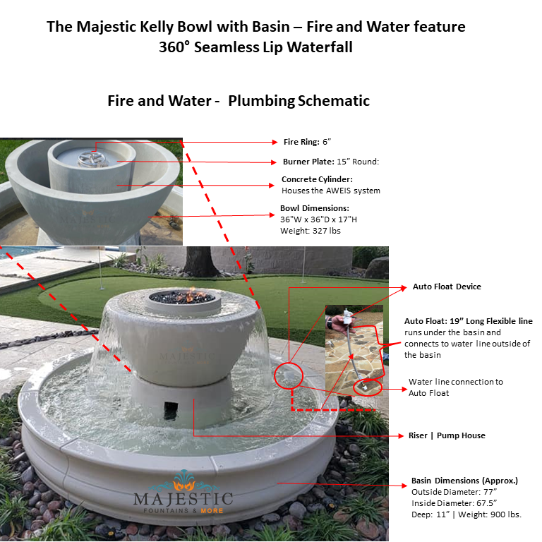 Presenting The Majestic Kelly Bowl with over 6ft wide Pool Basin in GFRC comes with 360 spill Fire and Water feature. This is the ultimate luxury in the water & fire features. Choose from Manual or Automatic AWEIS with Remote fire on/off use with natural gas or propane. It adds an extraordinary flair to any outdoor space. The Majestic Kelly Bowl is a beautiful fountain, but looks even more amazing with fire! This Fire Fountain has a mesmerizing effect and is ready to be the center piece of any gathering - night or day! The look of the fountain can be further enhanced with various LED programmable lighting for a mesmerizing effect.