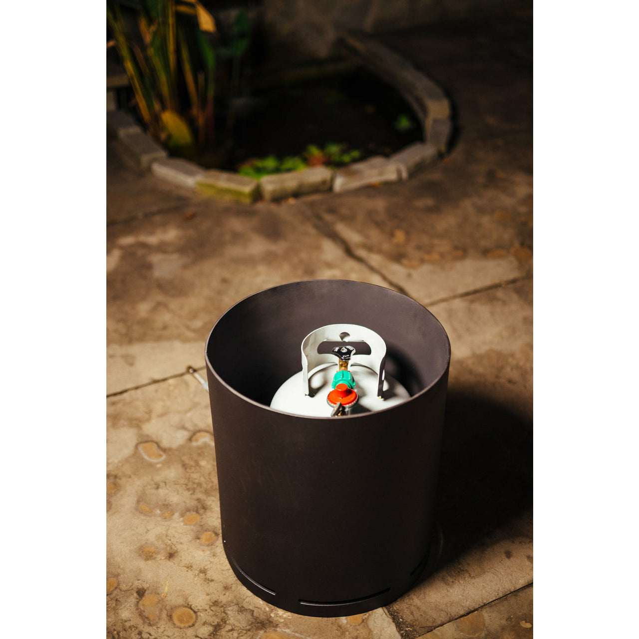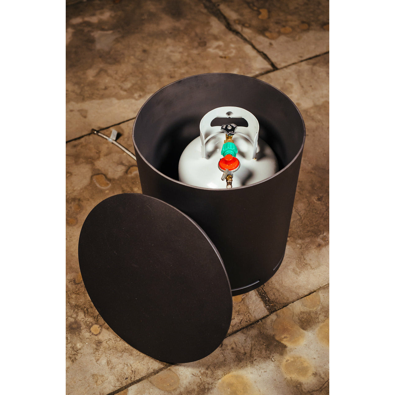 Discretely contain a liquid propane tank inside this carbon steel, hand-crafted Filling Station. This piece can also be used as a side table. The carbon steel is painted black.