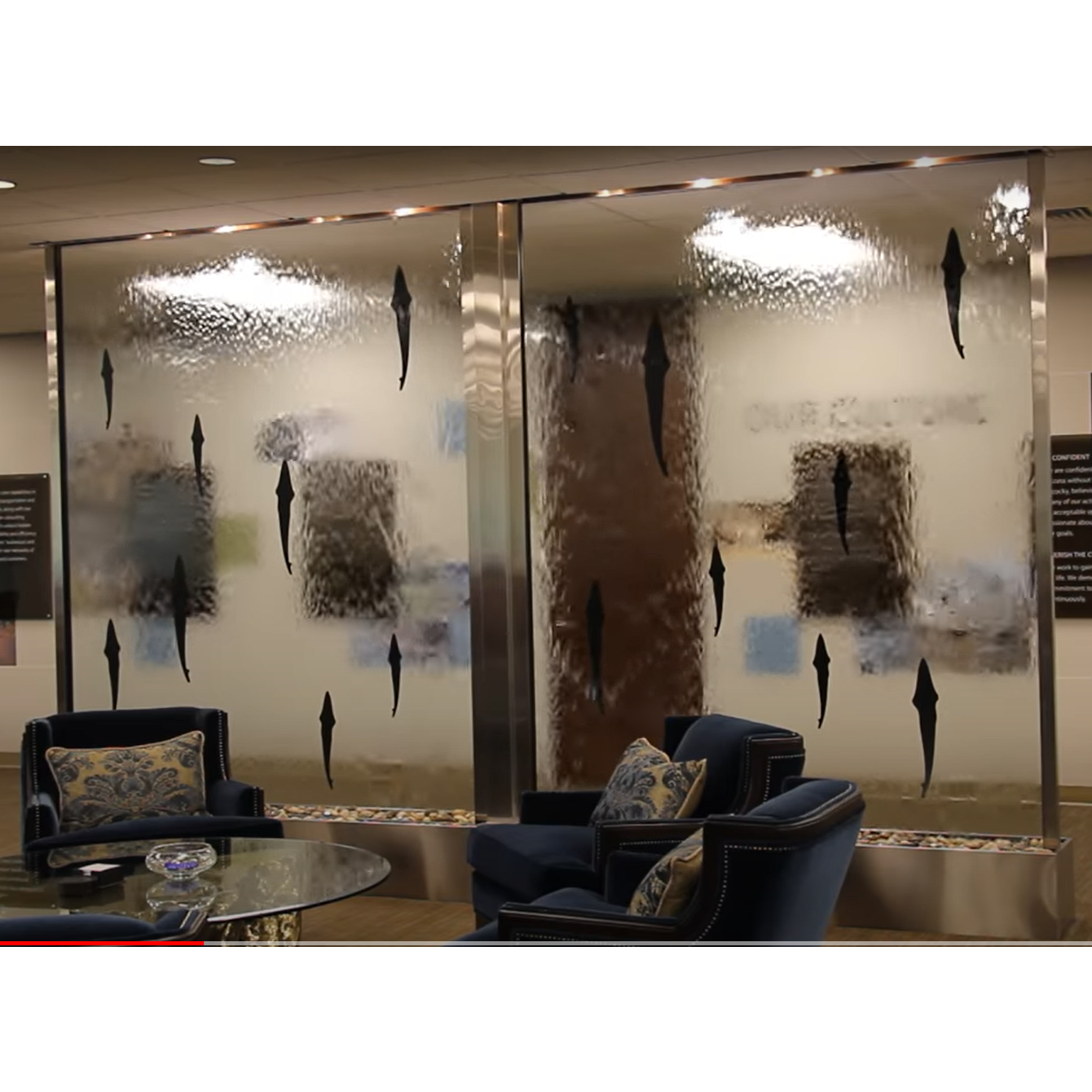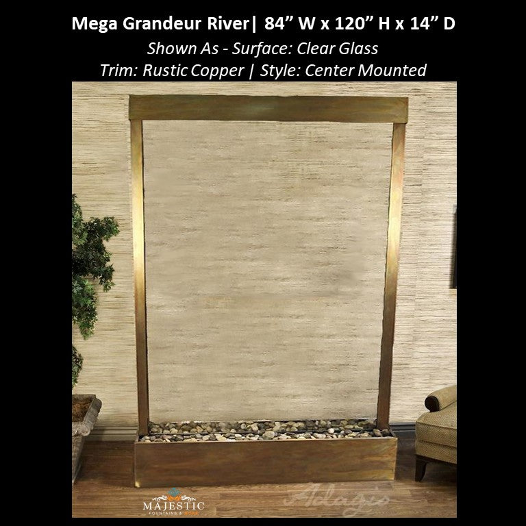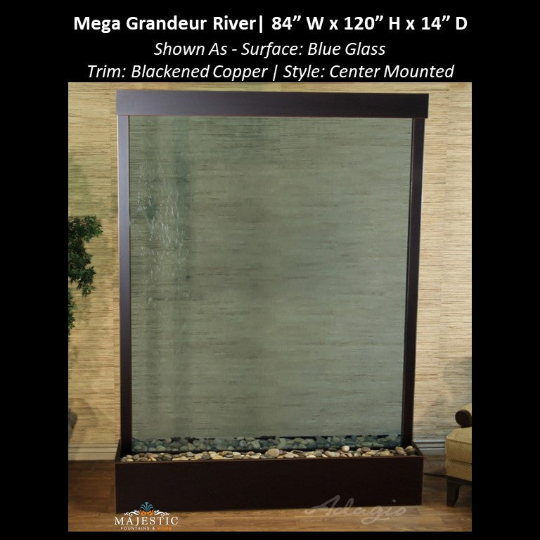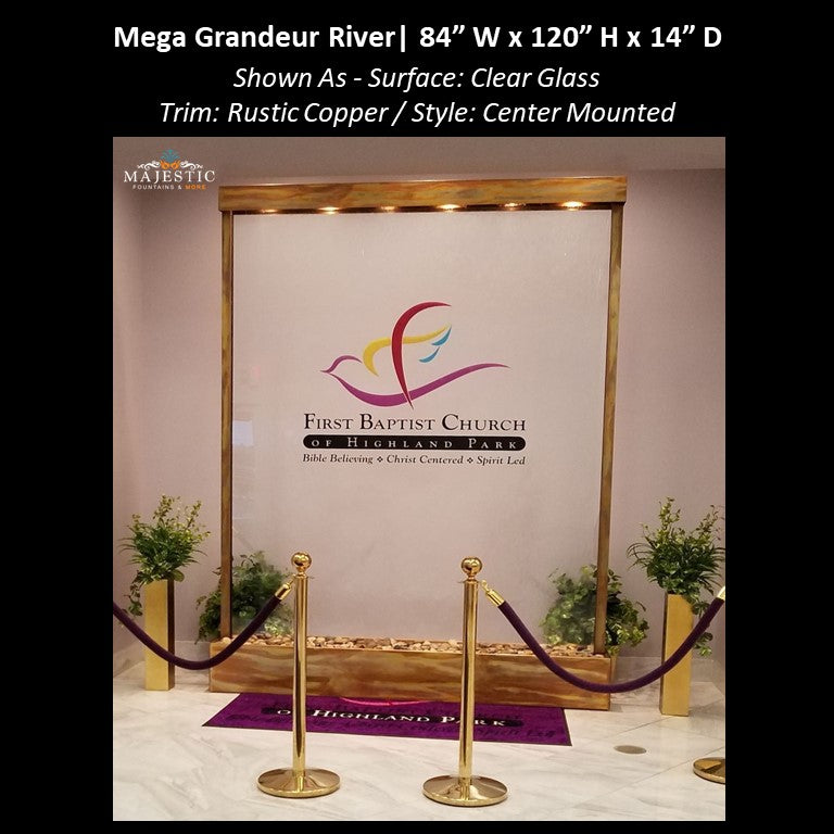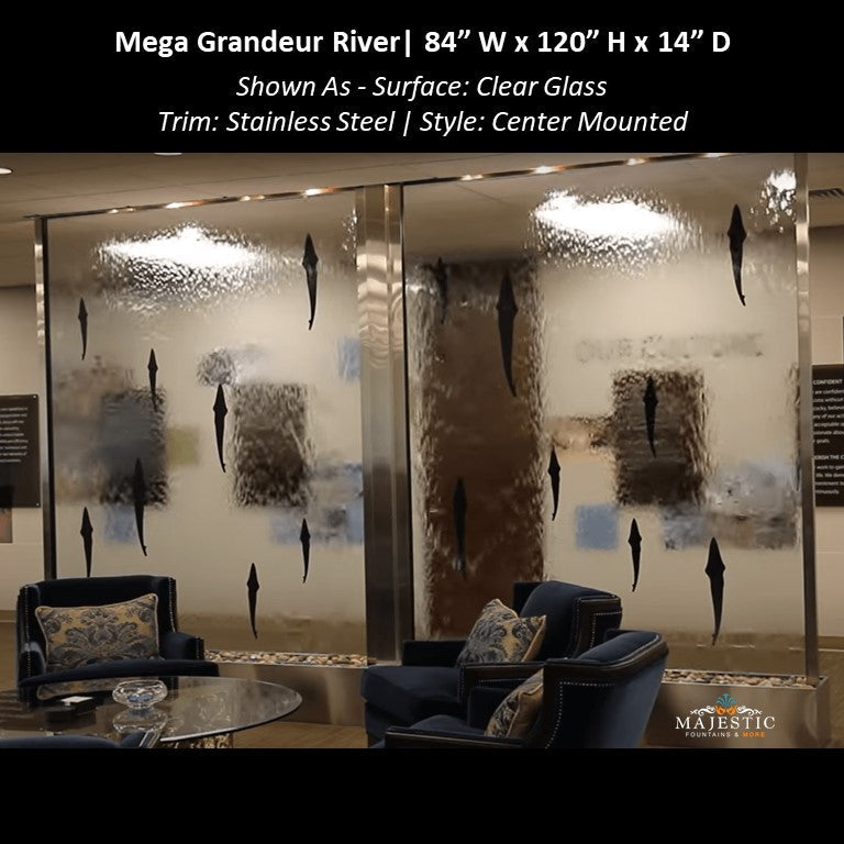 Encapsulation: Encapsulates the waterfall between your chosen surface option and an additional Clear Glass Surface. This allows for the Waterfall to be seen and heard but not touched as the water flow is contained between the two surface options. A wider Trim is used for this to hold the two Surfaces. The water is sealed on the top waterflow section but can still be accessed via the bottom tray. Encapsulation is only available for Center Mounted free standing floor fountains.