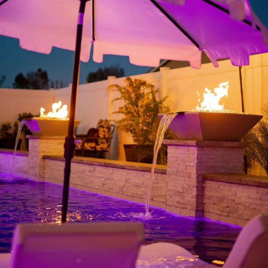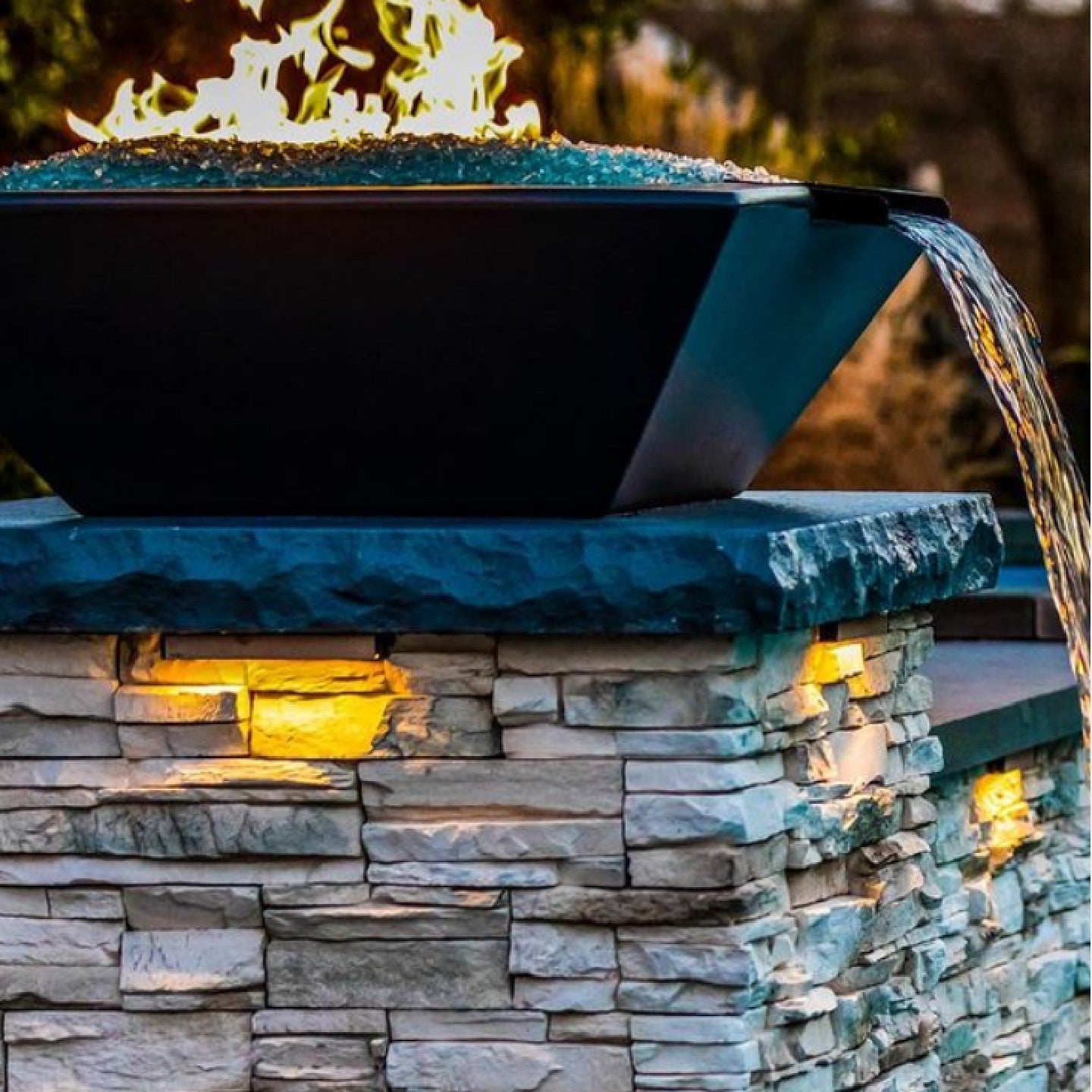 Elevate your outdoor living with this stunning fire and water bowl by Grand Effects.