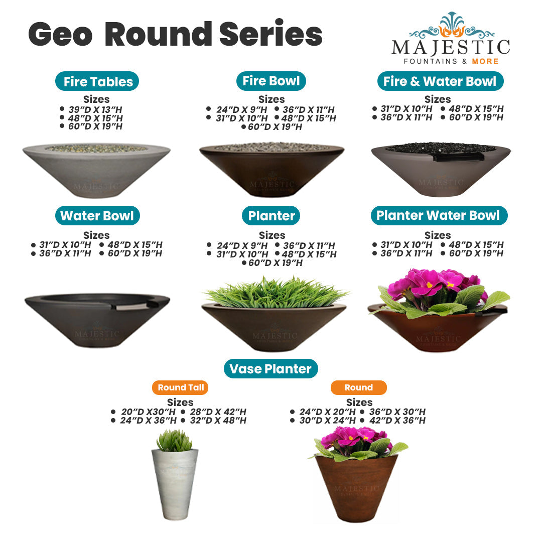 The Geo Fire Table, Fire Bowl, Fire & Water Bowl, and Planter Series comprise the following: