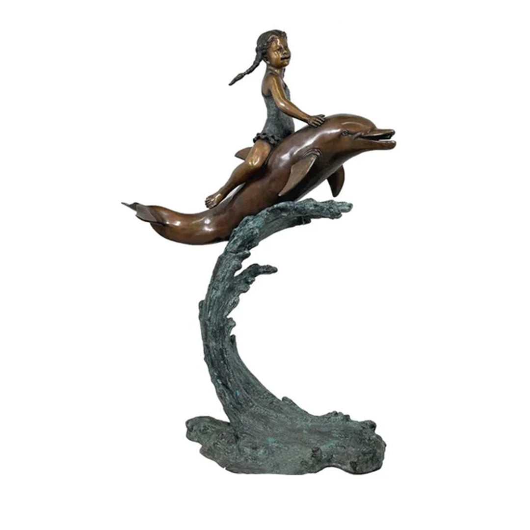 The Girl On Dolphin is an elegant animal fountain sculpture. It features a girl riding on a dolphin's back among the waves with the water streaming through the dolphin's mouth. This fountain sculpture is constructed of Bronze material which looks great.
