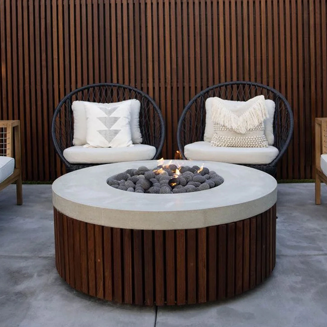 Transform your outdoor space with the luxurious Hampton Fire Table from the exquisite Elements collection by Prism Hardscapes. The stunning round table, measuring 48" in diameter, boasts a sleek GFRC top available in 6 sophisticated finishes, while the elegant brazilian wood base adds an air of exclusivity. Select either match-lit or electronic ignition for ultimate convenience. Elevate your patio and indulge in the art of outdoor living.