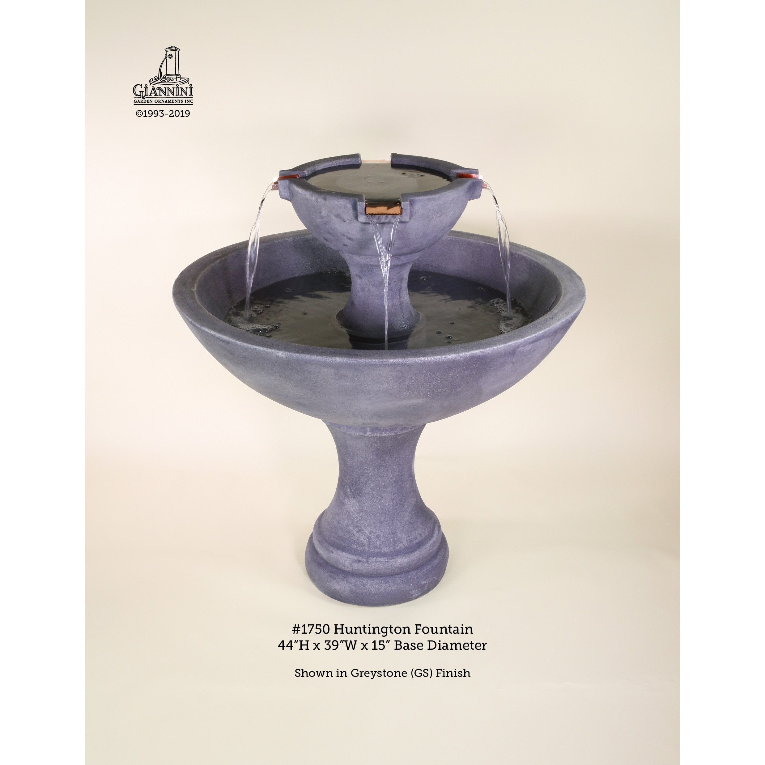 The Huntington Concrete Fountain by Giannini Garden Ornaments is a simple yet elegant design with a contemporary style. Its Bronze spouts are a brilliant addition to the spillover that styles your garden. This fountain creates a relaxing haven where you and your guests can unwind. Durably constructed of high-quality cast stone concrete, its construction enables years of functionality. The color finishes have been developed to hold up to the effects of sun and water.