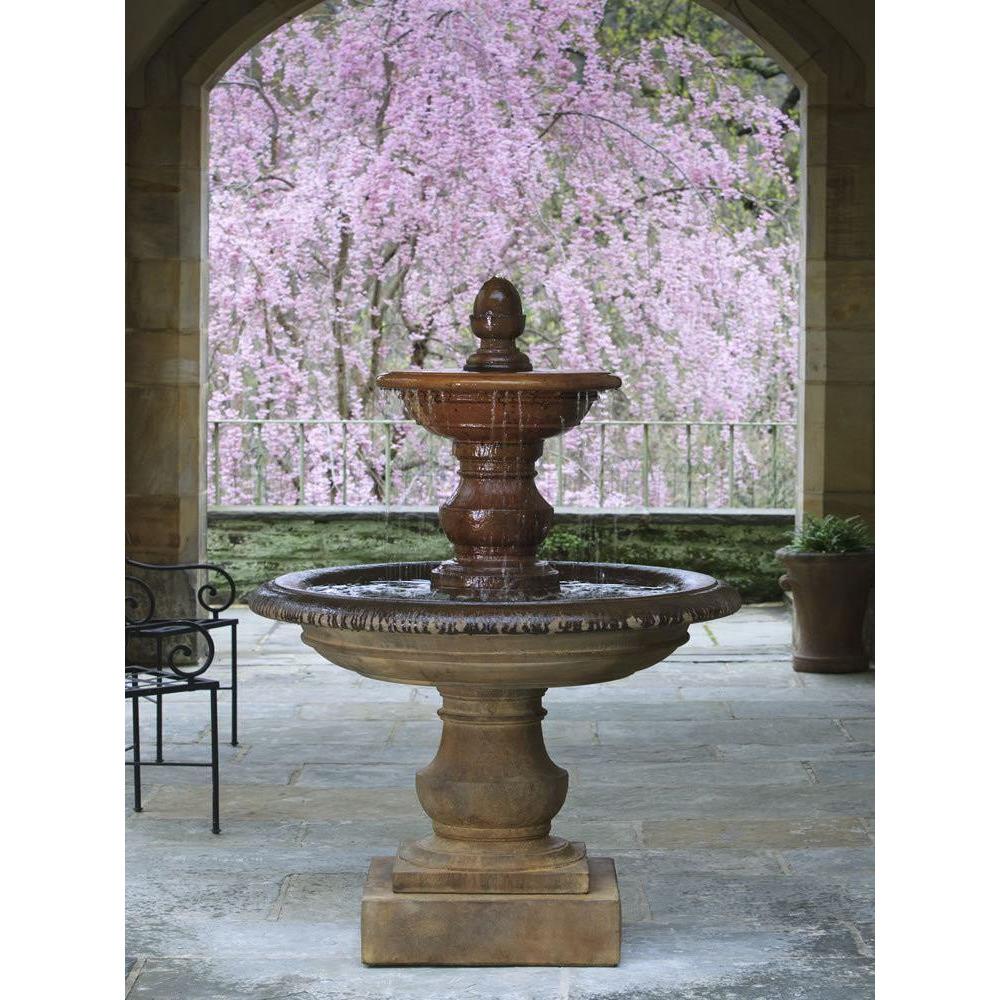 This 2-tiered outdoor water fountain is reminiscent of stunning Italian architecture. Resting on a square pedestal, the bottom tier consists of a rounded base and a round basin, while the top tier's foundation is located in its center. Featuring a wide, round column holding a larger basin, the second tier is topped with a further column. Water flows from this column into the top basin, where it overflows and cascades into the lower basin. The gentle water sounds are a feast for the ears, while the design delights the sight.