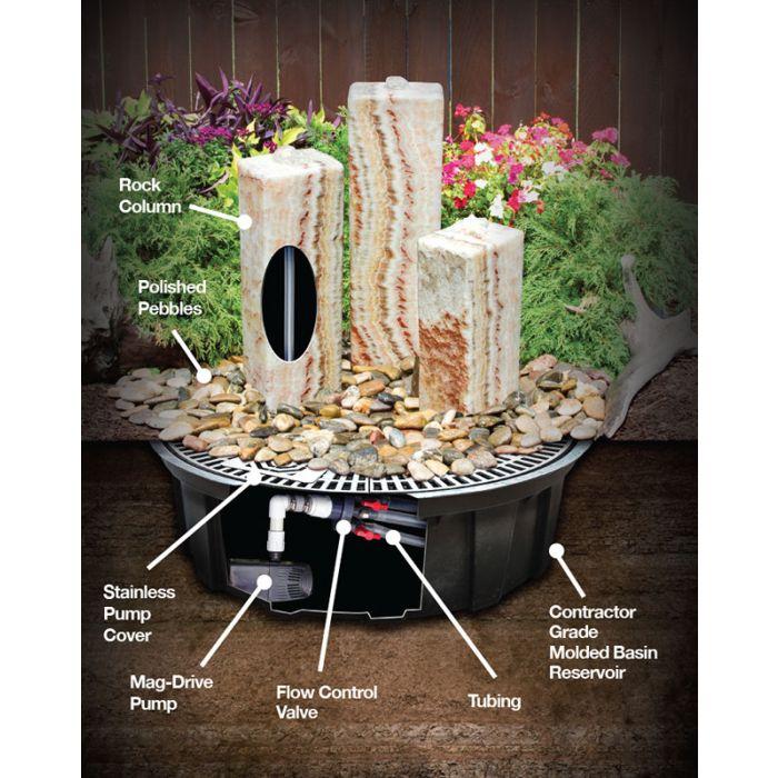 • Extra Tall Kit includes: Round Fountain Basin - 48”D X 16"H | 95 gal capacity, 1980 gph Mag-Drive pump, flow control valve, plumbing, & tubing