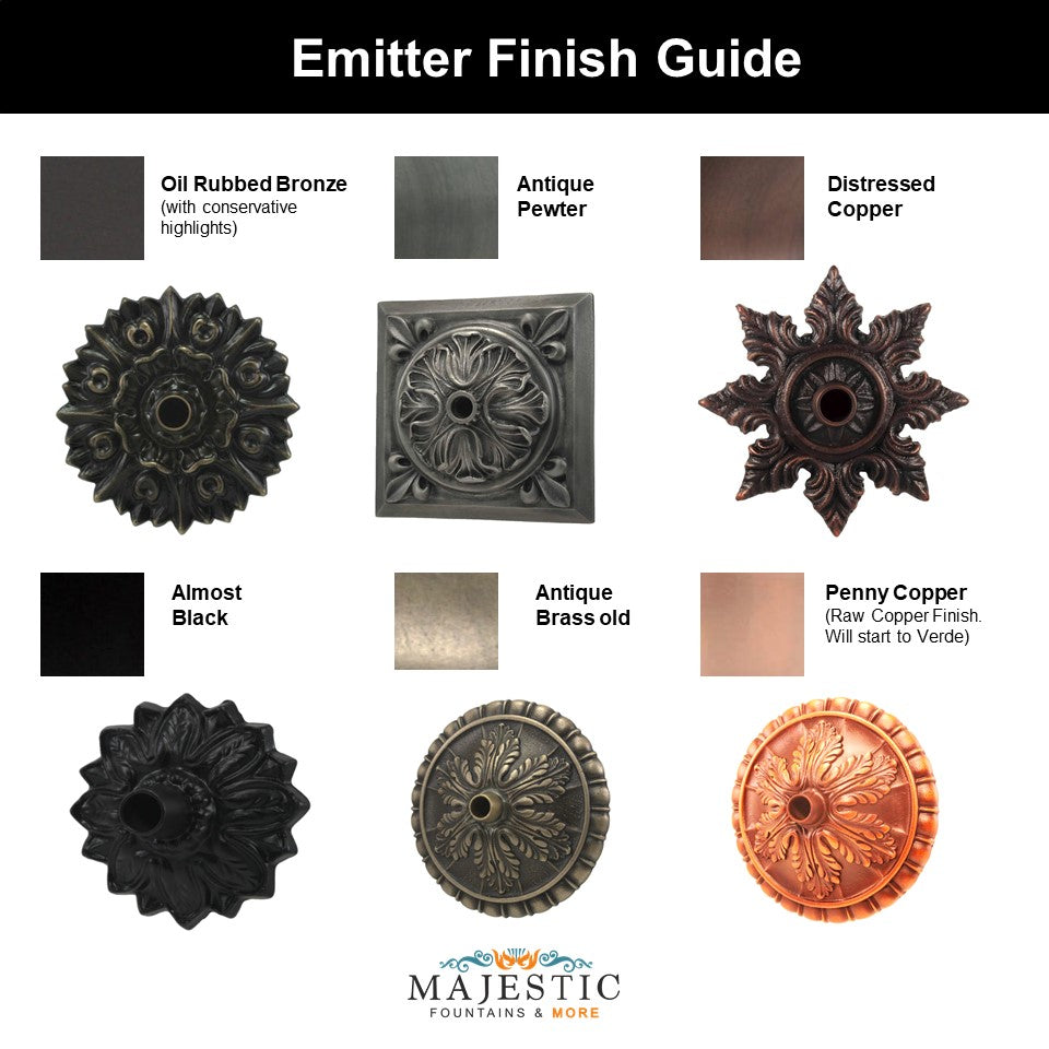 The Versailles offers the appearance of time-weathered cast iron but is crafted from non-rusting bronze and copper. The Versailles is versatile, equally suited for use as a solitary emitter in a mid-sized water feature or repeatedly in a pattern.
